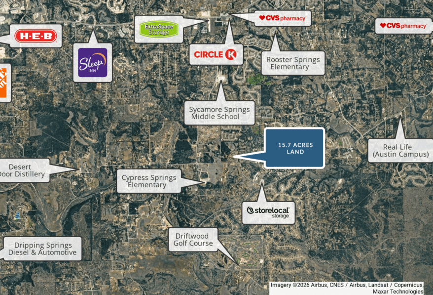 Sands Investment Group is pleased to exclusively offer for sale the land located at 10750 Darden Hill Road in Austin, Texas. This offering consists of approximately 15.7 acres of residential development land ideally suited for a 1-acre lot subdivision. The property is strategically located directly across from Cypress Springs Elementary School and the new Dripping Springs ISD high school campus, positioning it within one of the most desirable and rapidly growing corridors in the greater Austin MSA and offering strong potential for future residential development.