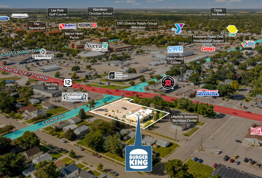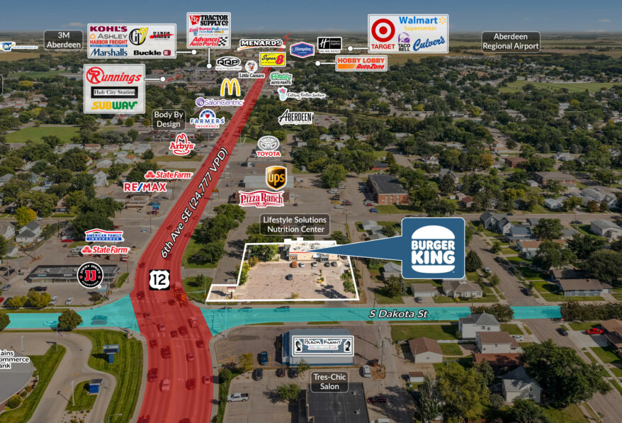 • Strategic Aberdeen Location: Situated at 908 Sixth Avenue SE, this Burger King is positioned on one of Aberdeen’s main commercial corridors, benefiting from significant traffic with over 24,000 vehicles passing daily. This high-visibility location provides strong brand exposure and ensures consistent customer traffic.