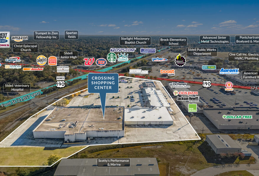 Sands Investment Group is pleased to exclusively offer for sale the 112,865 SF Crossing Shopping Center located at 104–110 Gause Boulevard in Slidell, Louisiana. The property is approximately 87% vacant, offering a rare opportunity for an investor to fully reposition the asset by resetting the tenant mix, layout, and long-term strategy without legacy lease constraints and the center features a 58,000 SF contiguous vacancy, providing multiple execution paths, including traditional retail re-tenanting or conversion to self-storage, a use supported by strong demand fundamentals and durable cash flow characteristics.