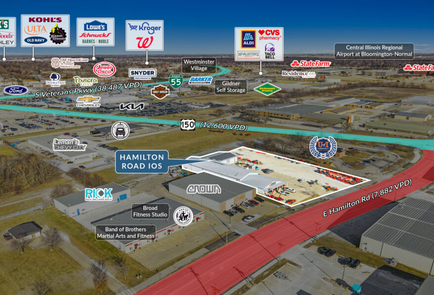 Sands Investment Group is pleased to exclusively offer for sale the 13,465 SF Hamilton Road Industrial Outdoor Storage (IOS) property located at 1716 E Hamilton Road in Bloomington, Illinois. The property sits on 1.43 acres and features a highly functional IOS configuration with yard exposure, multiple roll-up doors, and clear heights up to 18 feet, making it well-suited for a variety of industrial and service-oriented uses. Its layout supports both indoor and outdoor operational needs, a key driver of demand within today’s industrial market.