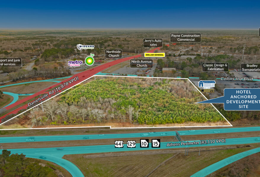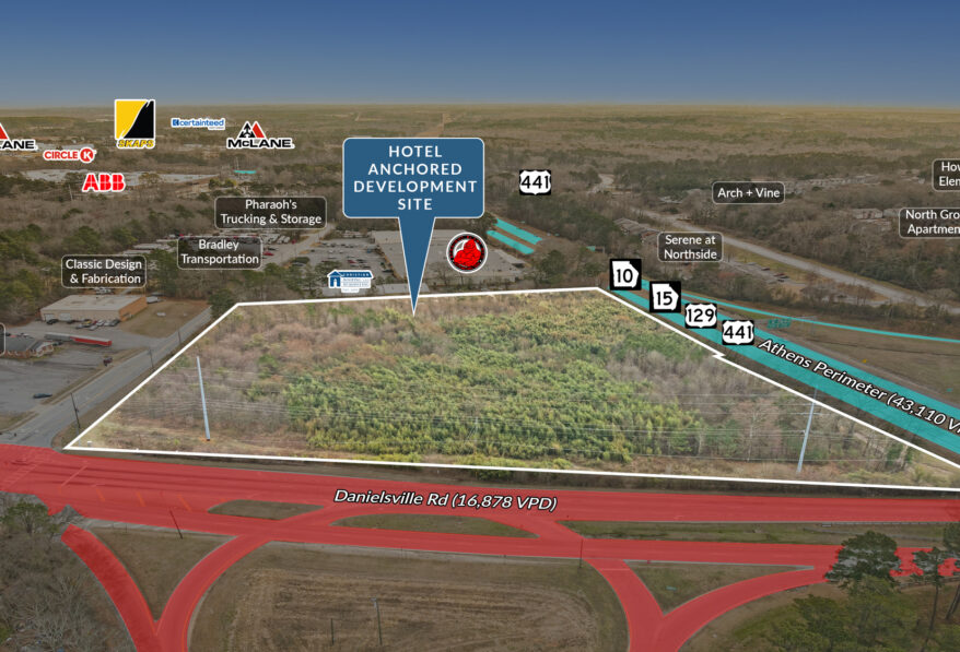 Sands Investment Group is pleased to exclusively offer for sale the Hotel Anchored Development Site located at 600 Danielsville Road in Athens, GA. The site is directly adjacent to the Downtown Athens exit along the Athens Perimeter, offering excellent visibility, strong traffic exposure, and convenient regional access. The property features CG (Commercial General) zoning, permitting a wide range of uses including retail, restaurant, hotel or motel, office, R&D, and theater or performing arts, making it a flexible opportunity for investors or developers.