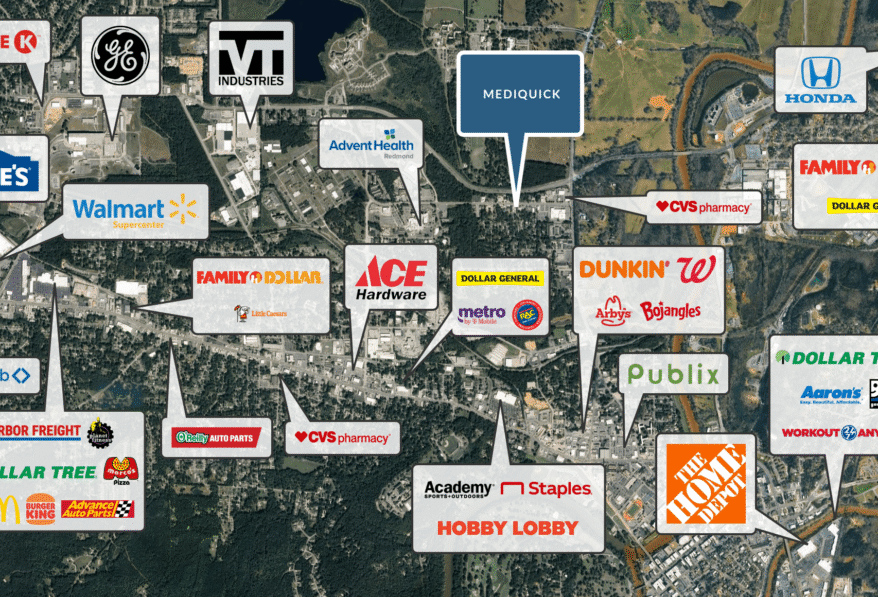 Sands Investment Group is pleased to offer for sale the 2,256 SF Mediquick Business and Real Estate located at 109 Redmond Road in Rome, GA. This opportunity allows for a discounted acquisition of both the business and real estate, with a clear sale-leaseback exit strategy. An investor can execute a 10-year Triple Net (NNN) Lease at $20/SF, implying an estimated real estate value of approximately $500,000, offering strong upside and a compelling investment opportunity.