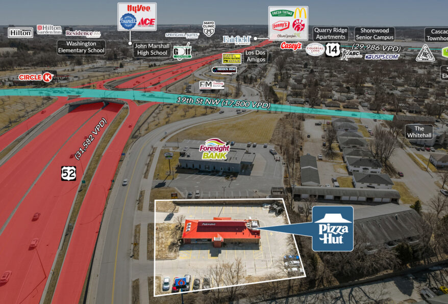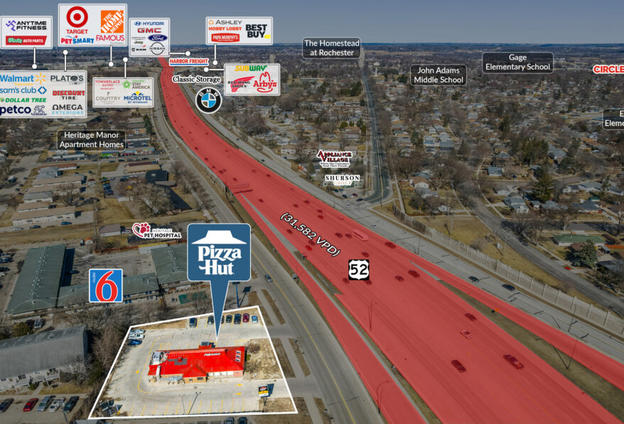 We are pleased to exclusively offer for sale the 2,925 SF Pizza Hut Absolute NNN located at 2001 West Highway 52 in Rochester, MN. The deal includes a long-term Absolute Triple Net (NNN) Lease with 13 years remaining on the primary term, along with 4 additional 5-year renewal options, providing extended income stability and zero landlord responsibilities. The lease features built-in 10% rent escalations every 5 years throughout the primary term and option periods, ensuring consistent and predictable NOI growth over time. The tenant is backed by Ayvaz Pizza, one of the largest Pizza Hut franchisees in the United States, offering strong credit and operational experience.