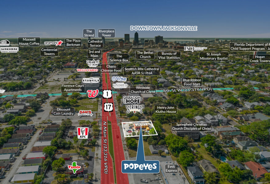 Sands Investment Group is pleased to exclusively offer for sale the 1,526 SF Popeyes Absolute NNN Asset located at 1902 N Main Street in Jacksonville, FL. The property benefits from 1.75% annual rent escalations, supporting consistent NOI growth and serving as a hedge against inflation. Solid in-place sales contribute to a favorable rent-to-sales ratio, reinforcing the tenant’s long-term stability and positioning the asset as an attractive net-leased investment opportunity.