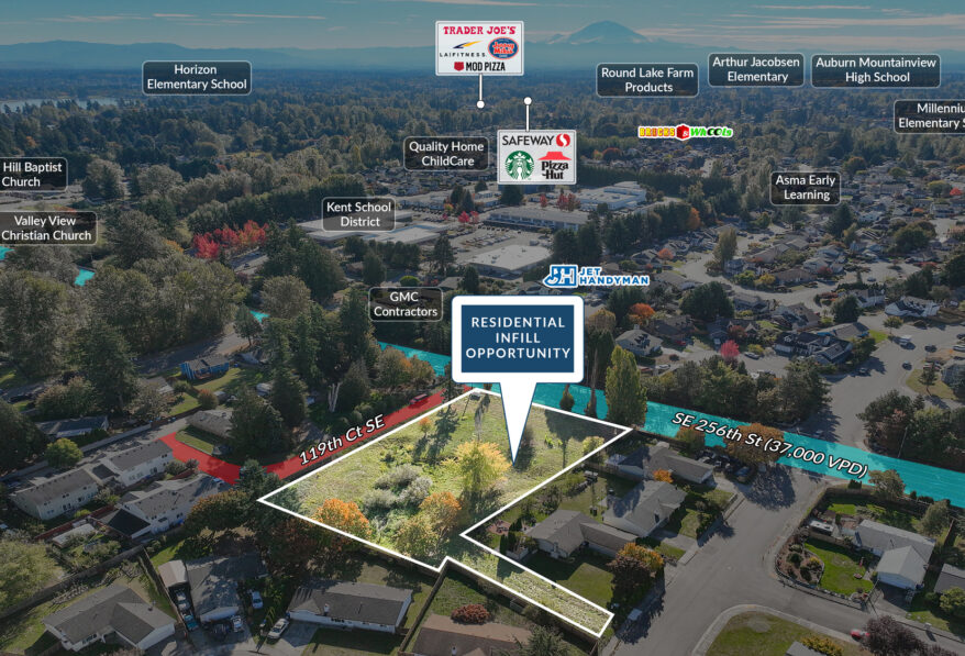Sands Investment Group is pleased to exclusively offer for sale the Residential Infill Opportunity Land Asset located at 11858 SE 256th Street in Kent, WA. This opportunity features 1.05 acres of prime infill land, allowing for the development of up to 15 residential lots (approximately $60K per lot). Newbuild homes within a quarter mile are selling between $800K and $1.29M, highlighting the strong demand and value potential in the area. The property’s infill location minimizes entitlement risk and aligns with the City of Kent’s long-term growth and housing objectives, making this an exceptional opportunity for builders and residential developers seeking a high-upside investment in a thriving suburban market.