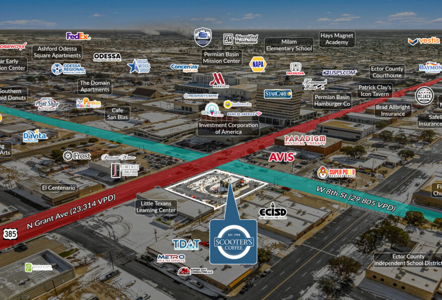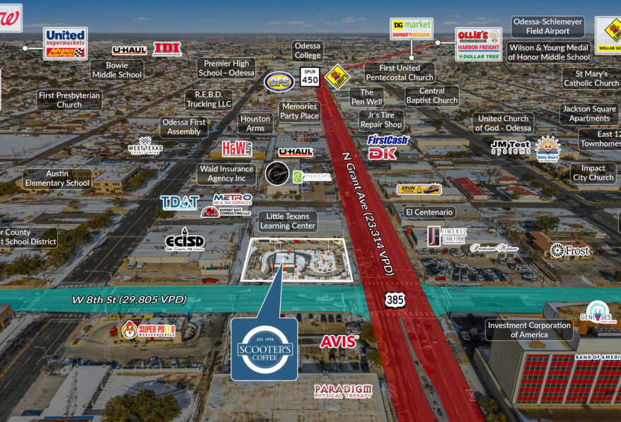 Sands Investment Group is pleased to exclusively offer for sale the 1,025 SF Scooter’s Coffee Asset property located at 801 N Grant Avenue in Odessa, Texas. This offering presents a flexible investment or owner-user opportunity, as the property is currently operating as Scooter’s Coffee but can also be delivered vacant at closing. The asset features a drive-thru capable layout, making it well-suited for coffee, fast-casual, or other quick-service restaurant concepts seeking a functional small-footprint building with strong operational efficiency.