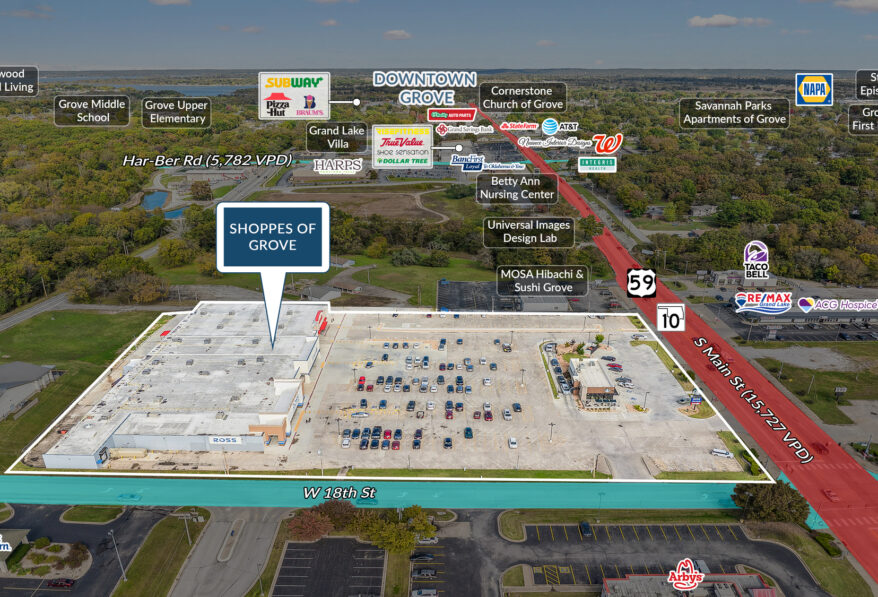 Sands Investment Group is pleased to exclusively offer for sale the new construction 62,225 SF Shoppes of Grove NNN featuring Ross, Marshalls, Bealls, and a 2,225 SF Starbucks outparcel located at the signalized intersection of S Main St & W 18th St in the city of Grove, Oklahoma. With a WALT of over 8 years and 68% of the GLA made up of investment-grade credit, this asset provides an investor with a long-term, secure income stream. Each lease features increases every 5 years, providing a hedge against inflation. The subject property is situated on the main retail arterial within the trade area and benefits from a destination location across the street from a Walmart Supercenter, Lowe’s Home Improvement, and other highprofile retailers. Offered at below $146 PSF and a 6.67% CAP rate, this opportunity offers an attractive yield compared with alternative investment opportunities at below replacement cost.