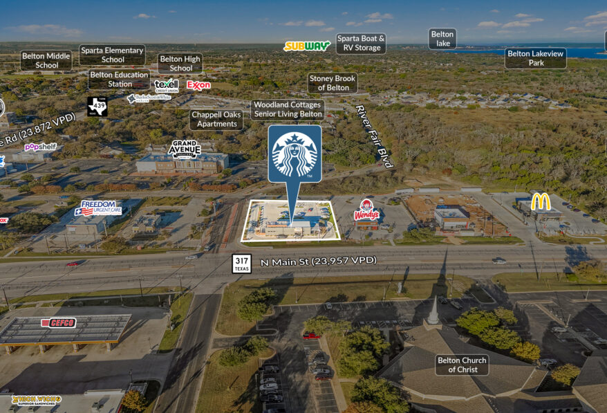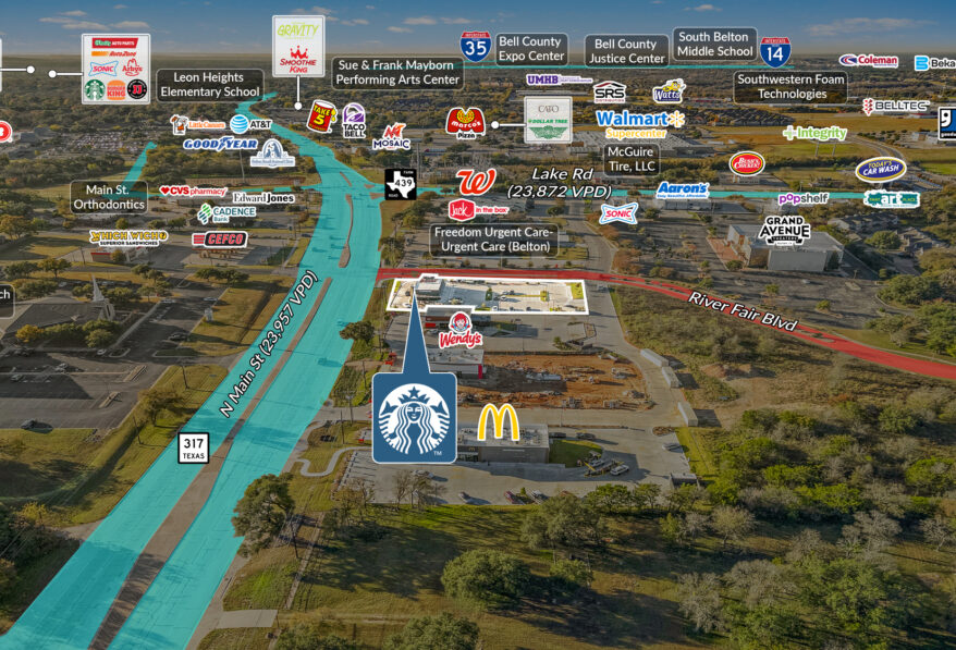 Sands Investment Group is pleased to exclusively offer for sale the 2,250 SF Starbucks NNN Asset located at 104 River Fair Boulevard in Belton, TX. Starbucks is the world’s largest specialty coffee retailer, with 40,000+ locations globally, and is one of the most recognized consumer brands in the world. The property is strategically positioned within the Killeen Temple Fort Hood MSA, one of the fastest-growing regions in Central Texas, making it a high-quality, long-term investment opportunity.
