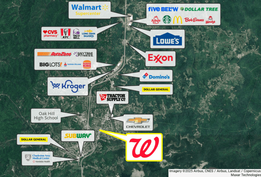 Sands Investment Group is pleased to present the exclusive offering of a ±11,180 SF Walgreens NN Asset located in Oak Hill, WV. This property features a double net (NN) lease with minimal landlord responsibilities and a dependable passive income stream. Originally constructed for Rite Aid and fully converted by Walgreens in 2018, they invested over $300,000 in capital improvements, underscoring their long-term commitment to the site. The lease includes four 5-year renewal options, each with scheduled rental increases. Strategically positioned along Oak Hill’s primary commercial corridor and surrounded by regional medical facilities, national retailers, and community amenities, the property benefits from steady traffic and consistent prescription demand. This offering presents an excellent opportunity to acquire a high-performing, net-leased property with strong fundamentals, minimal management, and durable long-term upside.